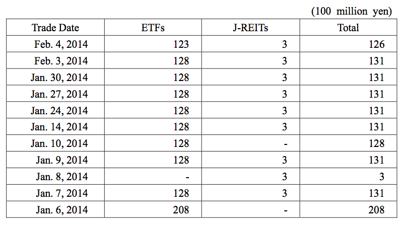 Noah Smith and David Andolfatto think that Abenomics conclusively proves that quantitative easing boosts inflation. But Abenomics has nothing to do with quantitative easing and everything to do with qualitative easing. Every week, the Bank of Japan (BoJ) purchases Topix and Nikkei 225 ETFs till it hits an annual limit of around 1 trillion yen (see table below for last month’s purchases). It also purchases a much smaller amount of real estate investment trusts (REITs). Abenomics has nothing to do with increasing the “money supply” and everything to do with propping up asset prices.